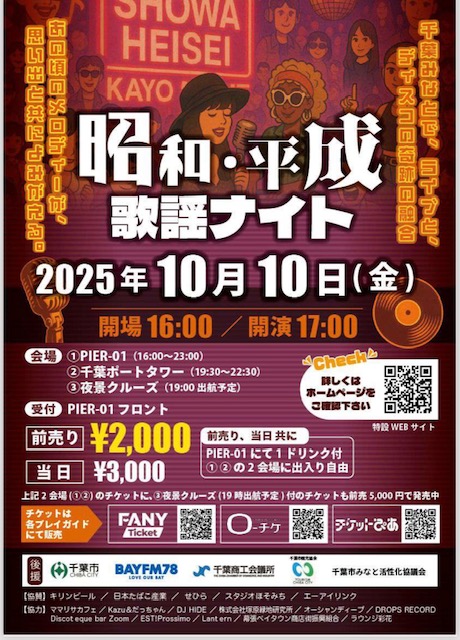 2025年10月10日に千葉みなとケーズハーバーやポートタワーにて行われる、「昭和・平成歌謡ナイト」に出演します!ひとみんズはバンド編成で、18:00~レストランPIER-01内で昭和の名曲の数々を歌います。さんばし広場の大型ビジョンでも見られるそうです。金曜の夜は、一緒にフィーバーしましょう!!
