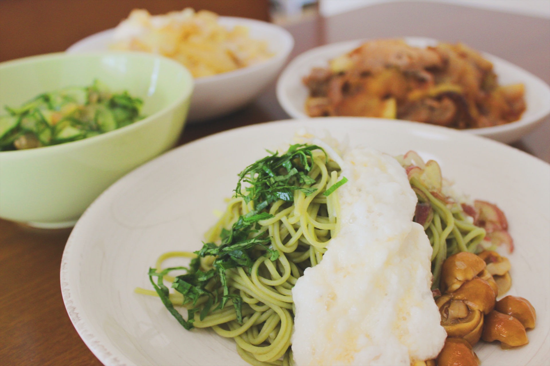 茶そばには、とろろやなめこなどのねばねば食材をぶっかけました(^ ^)