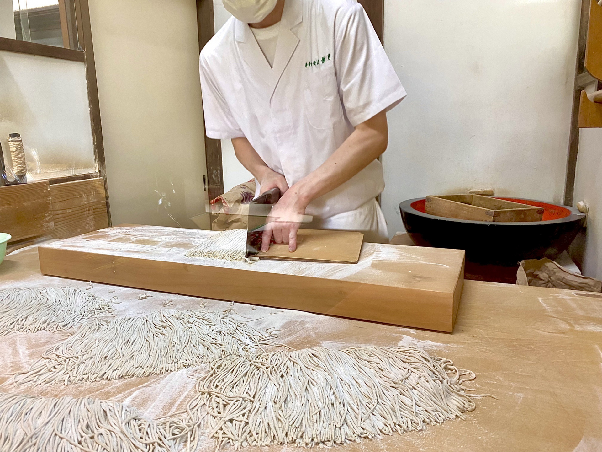 店内入って右奥に蕎麦打ち用のガラスの小部屋があり、今回はここで作業している姿を見ることができました。