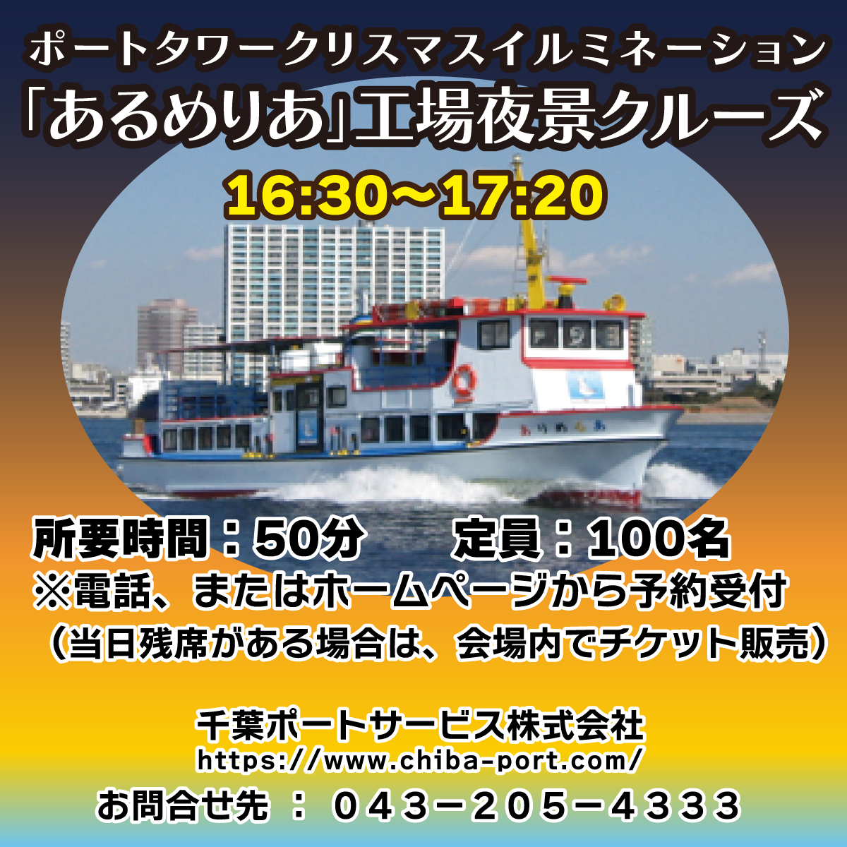 16時30分より千葉港遊覧船『あるめりあ』で人気の工場夜景クルーズを開催!