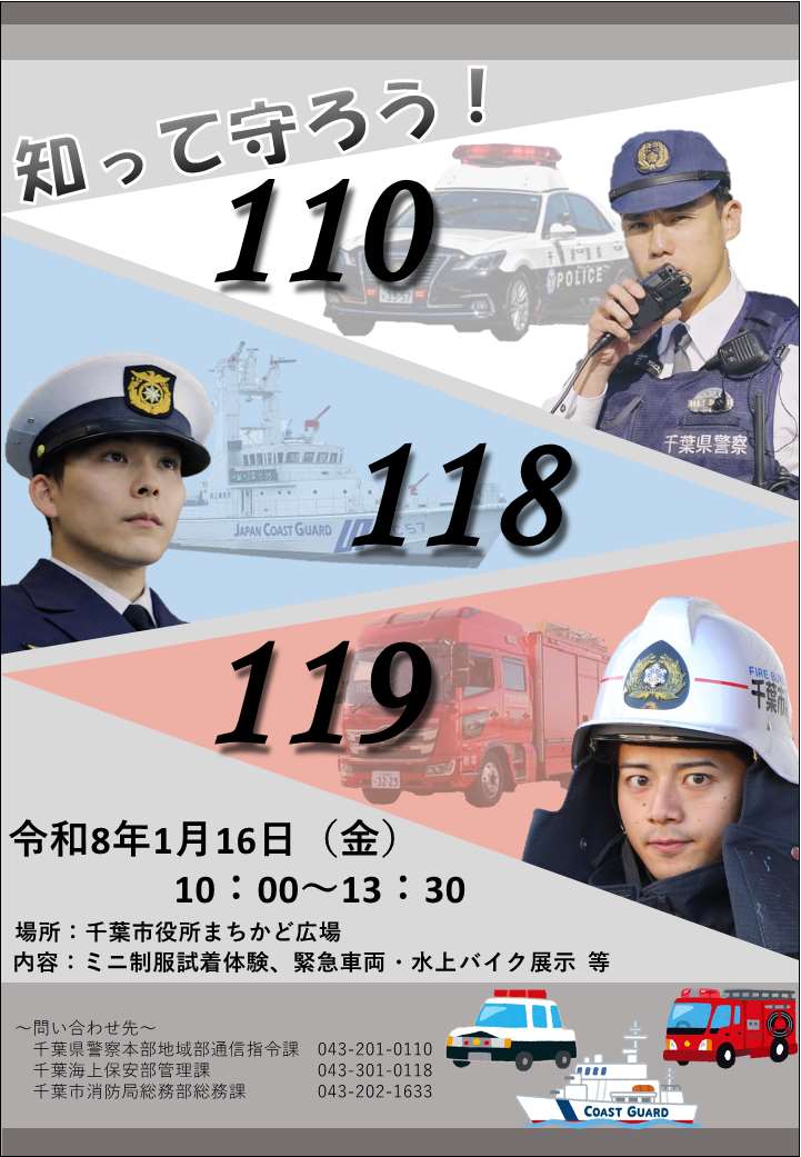 警察の110番、海上保安庁の118番、消防の119番の認知度上・適正利用を目的に周知イベントを開催します。水上バイク、消防ポンプ車やパトカー、白バイを展示!ミニ制服の試着体験も!