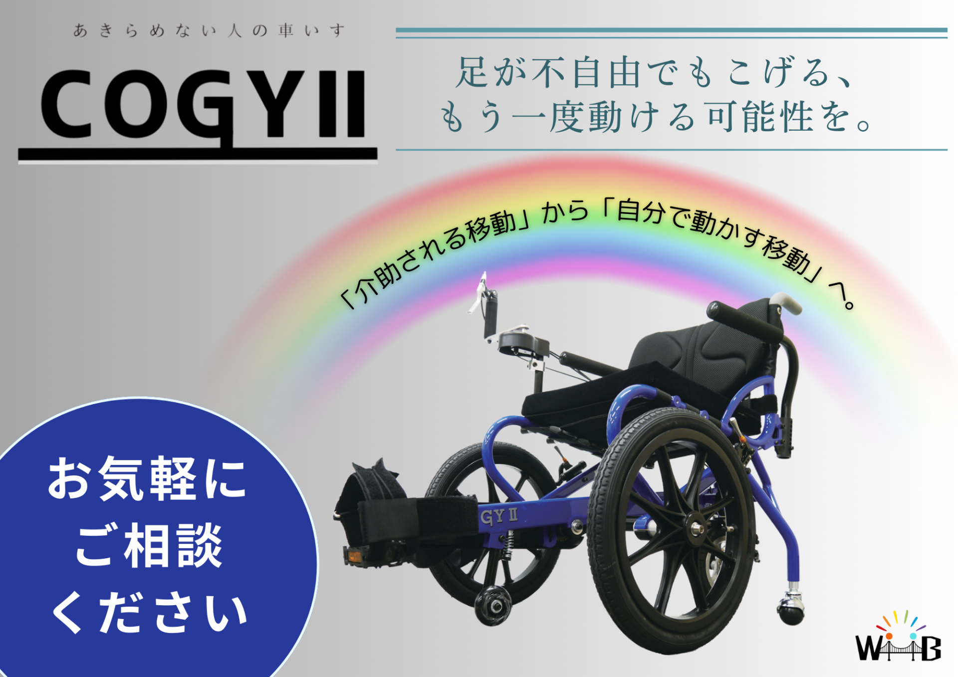 その想いから生まれたのが、足こぎ車椅子 COGY(コギー) です。
